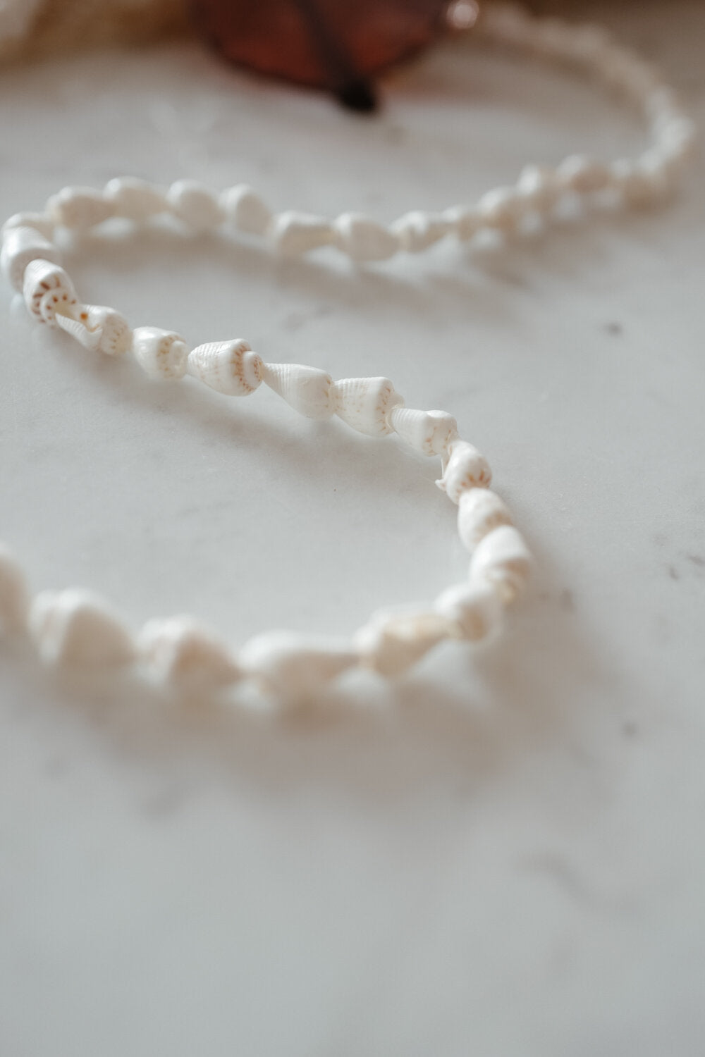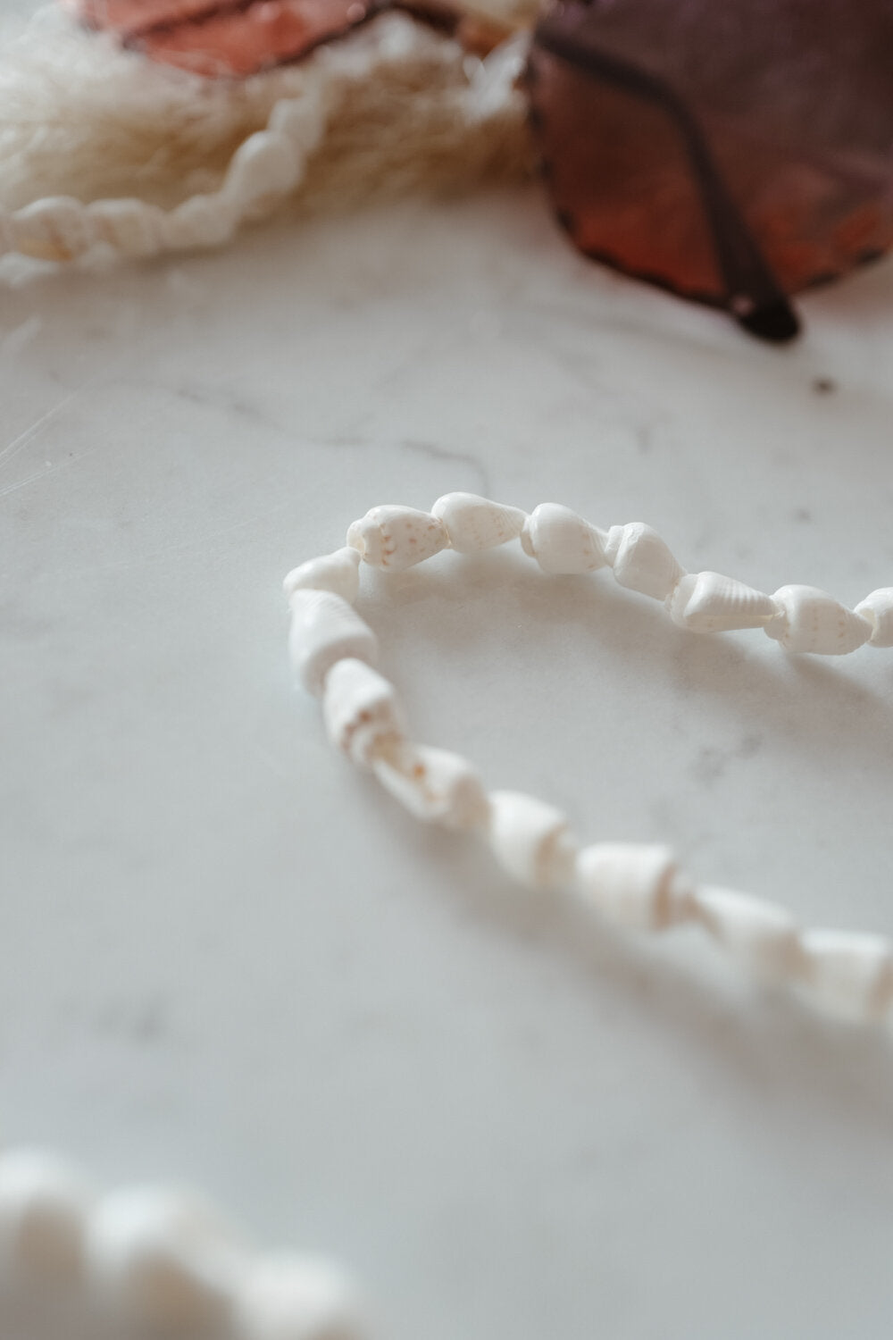 Unsere Clarine Necklace ist eine Brillenkette mit weißen Muscheln, welche auch als Masken-Kette getragen werden kann.