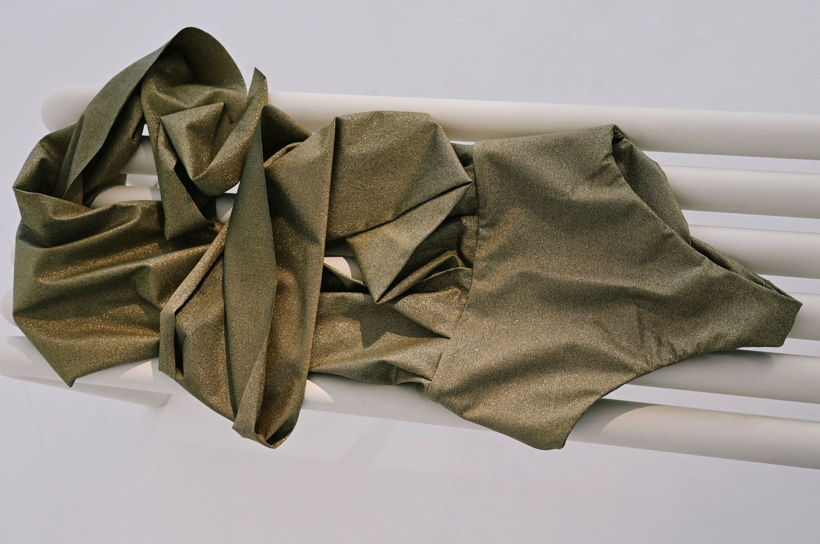 Fair produziert aus einem funkelndem Sparkle-Stoff, der in einer spanischen, traditionsreichen Stoffweberei gefertigt wird. Lokal genäht in unserer kleinen Couture-Schneiderei bei Budapest. 100% plastikfrei verpackt. Verdeckt vernäht und so beidseitig zu Tragen. Keine offene Naht sichtbar.