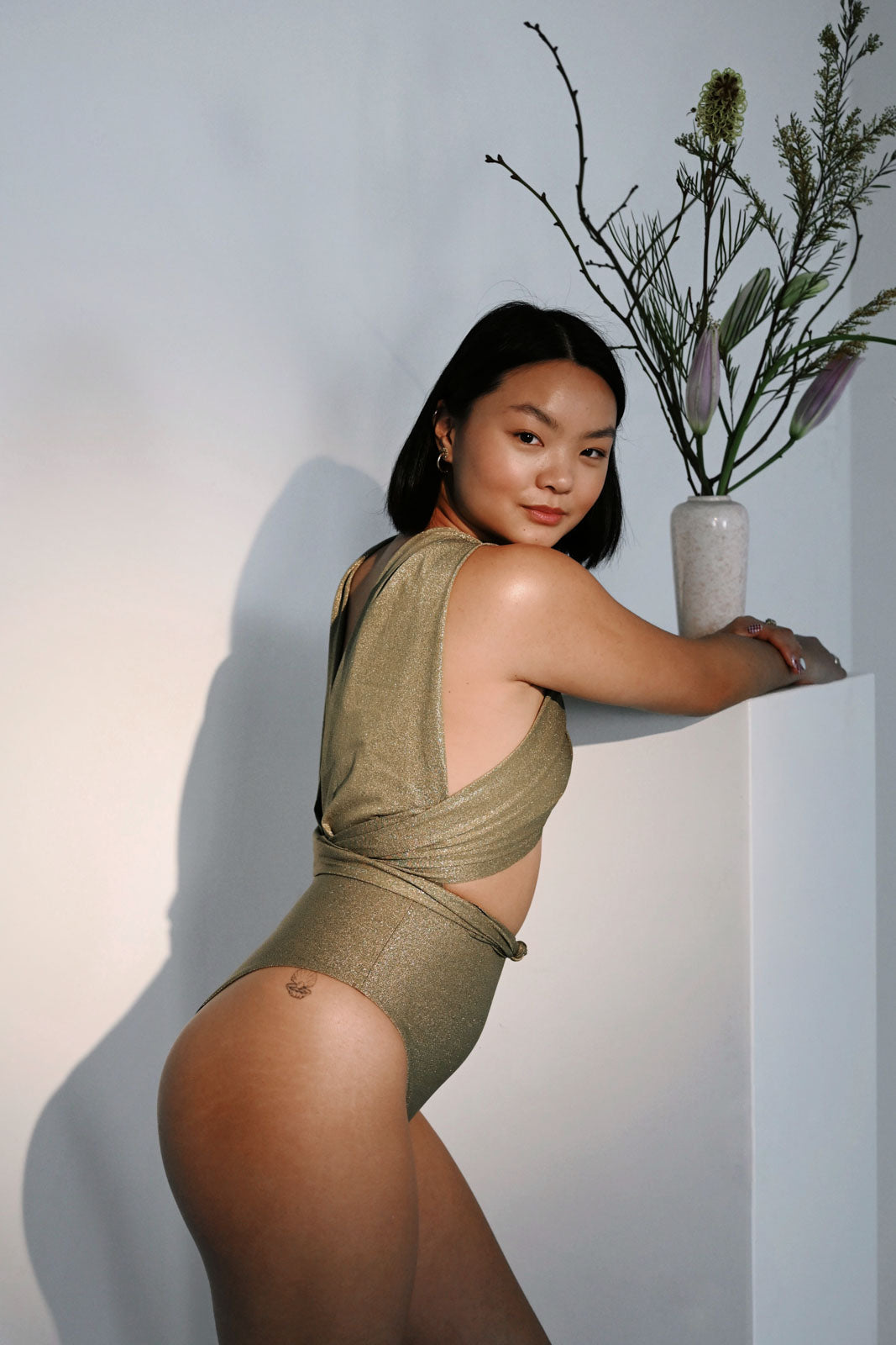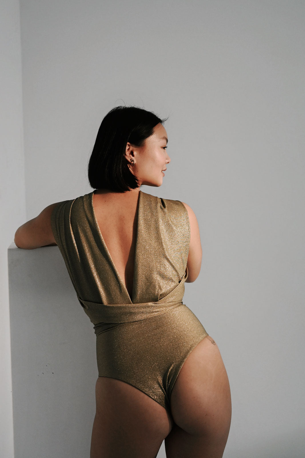 Du kannst unseren Swimsuit klassisch mit 3/5 Po-Bedeckung tragen, oder auch höher gezogen etwas sexier mit “cheeky shape”.
